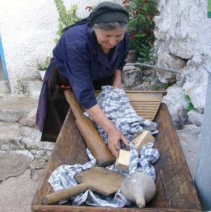 Με ένα σαπούνι που το έφτιαχναν από λάδι, τα σαπούνιζαν και τα έβαζαν σε μια άκρη. Η σκάφη ήταν συνήθως ξύλινη. Αφού τελείωνε το σαπούνισμα, τα ξέπλεναν στη βρύση της αυλής ή αν δεν είχαν, τα πήγαιναν στην κεντρική βρύση του χωριού. Έπειτα τα άπλωναν σε σχοινιά που είχαν κρεμασμένα στην αυλή τους. Τα λευκά τα ρούχα τα ξαναέβραζαν στο καζάνι, χωρίς στάχτη, για να είναι λαμπερά. Επίσης χρησιμοποιούσαν και λουλάκι!