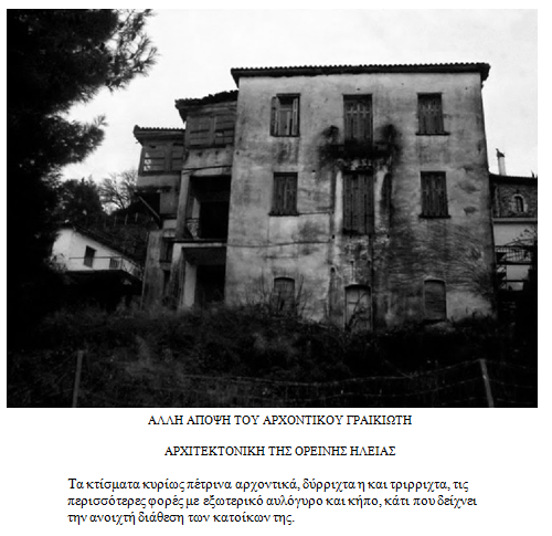 Τα σπίτια της, άλλα καινούργια κι’ άλλα παλιά σκορπίζονται στις κατηφόρες της φαρδιάς περιοχής, ανάμεσα στη Μίνθη, το Λύκαιο και το Νομίωντα, βουνά που βοήθησαν τους ντόπιους, σκεπάζοντας τους, από επιθέσεις κουρσάρων και Αγαρηνών που ρήμαζαν τα πλούσια πεδινά, μα δεν διάκριναν το χωριό, έτσι χωμένο όπως είναι.