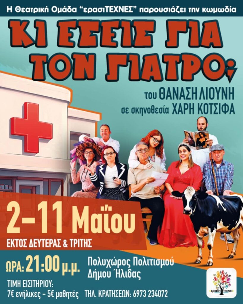 Πρεμιέρα κάνει την Παρασκευή 2 Μαΐου στον Πολυχώρο Πολιτισμού Ήλιδας η σύγχρονη κοινωνική, ξεκαρδιστική κωμωδία του Θανάση Λιούνη «Κι εσείς για τον γιατρό;», σε σκηνοθεσία Χάρη Κότσιφα, από την θεατρική ομάδα «ερασιΤΕΧΝΕΣ» Αμαλιάδας.