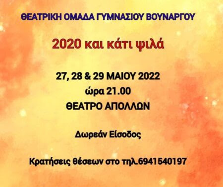 Πρεμιέρα στις 27 Μαίου 2022 στο Θέατρο Απόλλων στον Πύργο για την θεατρική παράσταση “2020 και κάτι ψιλά” από την Θεατρική Ομάδα του Γυμνασίου Βουνάργου.