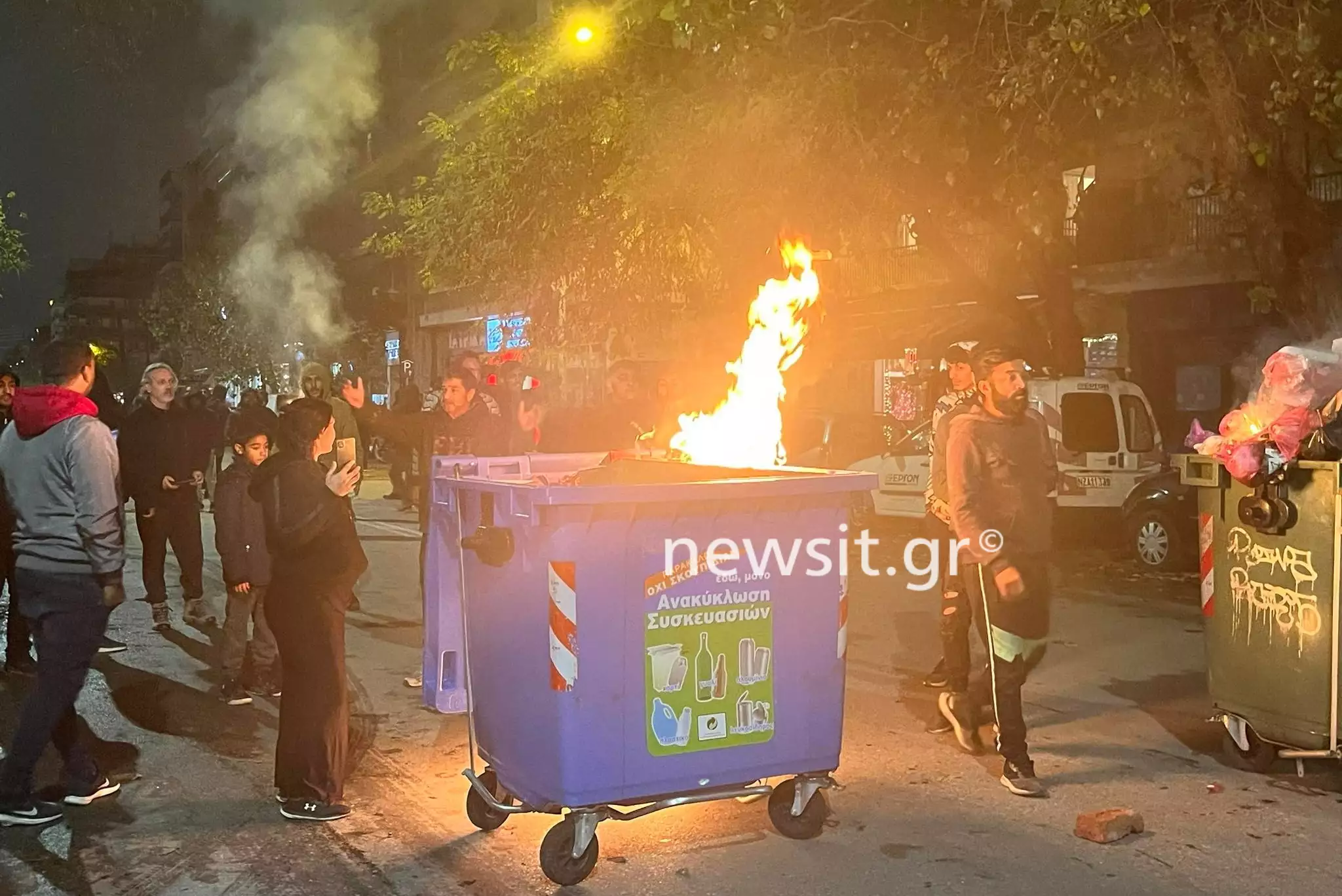 Ρομά έχουν συγκεντρωθεί και καίνε κάδους, φωνάζοντας συνθήματα κατά των αστυνομικών. Νωρίτερα, το μεσημέρι σημειώθηκαν συμπλοκές με αστυνομικούς, στους οποίους επιτέθηκαν με καρέκλες, τραπέζια και άλλα αντικείμενα.