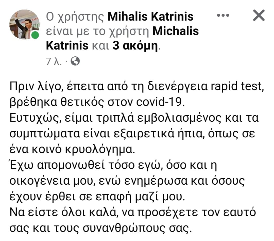 Ο Μιχάλης Κατρίνης, βουλευτής Ηλείας και επικεφαλής της Κοινοβουλευτικής Ομάδας του ΚΙΝΑΛ βρέθηκε θετικός στον κορονοϊό και το ανακοίνωσε ο ίδιος μέσα από το προφίλ του στα social media. Είναι τριπλά εμβολιασμένος και μέχρι τώρα τα συμπτώματά του είναι ήπια.