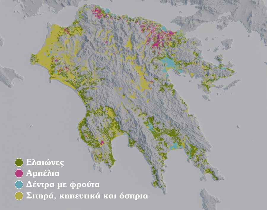 Στην εικόνα βλέπετε τους διαφορετικούς τύπους καλλιεργειών της Πελοποννήσου. Τα δεδομένα που βλέπετε προέρχονται από το CLC-Corine Land Cover, European Union, Copernicus Land Monitoring Service, European Environment Agency σε συνδυασμό με νούμερα που παρέχει η Ελληνική Στατιστική Υπηρεσία.