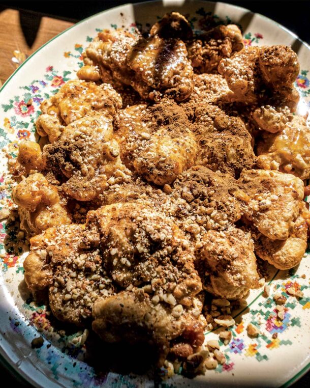 - Σερβίρουμε τις τηγανίτες ζεστές, περιχυμένες με μέλι και πασπαλισμένες με καρυδόψιχα, κανέλα και σουσάμι.