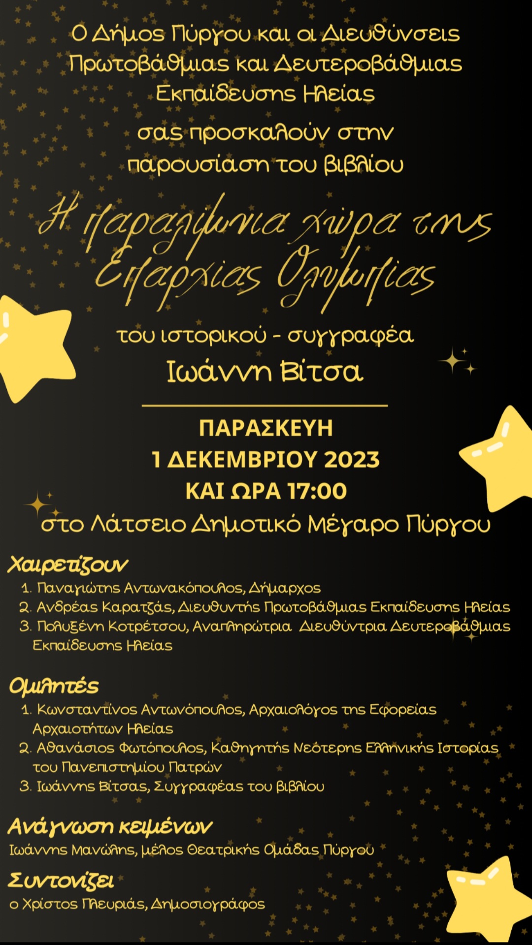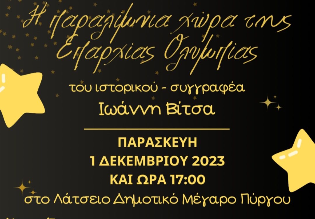 Την Παρασκευή 1/12 η παρουσίαση βιβλίου του Ι. Βίτσα ¨Η παραλίμνια χώρα της επαρχίας Ολυμπίας¨