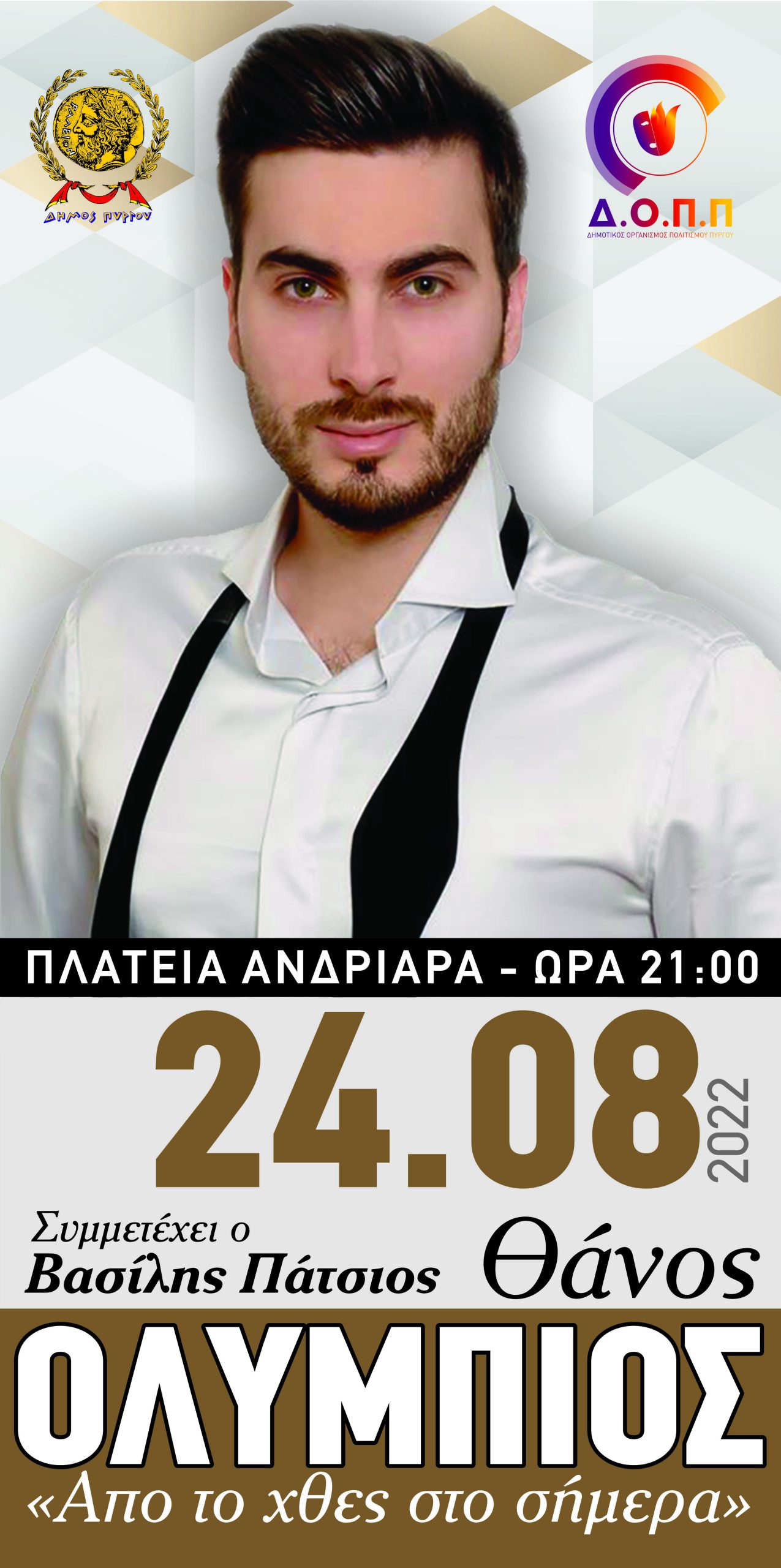 Πλέον, την Τετάρτη 24/8, στις 21.00, στην πλατεία Ανδριάρα στον Πύργο, μετά λοιπόν την ολοκλήρωση του έργου και της παράδοσης της προς χρήση στους πολίτες, θα πραγματοποιηθεί μια λιτή εκδήλωση-γιορτή με αποκορύφωμα τη μουσική συναυλία του Πυργιώτη καλλιτέχνη Θάνου Ολύμπιου (και με τη φιλική συμμετοχή του Βασίλη Πάτσιου). Με τίτλο «Από το χθες στο σήμερα», οι Ηλείοι τραγουδιστές με τη συνοδεία τετραμελούς ορχήστρας, θα ερμηνεύσουν έντεχνα και λαϊκά τραγούδια αλλά και τραγούδια από την προσωπική δισκογραφία του Θάνου Ολύμπιου, σε στίχους Μάνου Ελευθερίου, Λευτέρη Παπαδόπουλου κ. α. και συνθέσεις του Μίμη Πλέσσα.