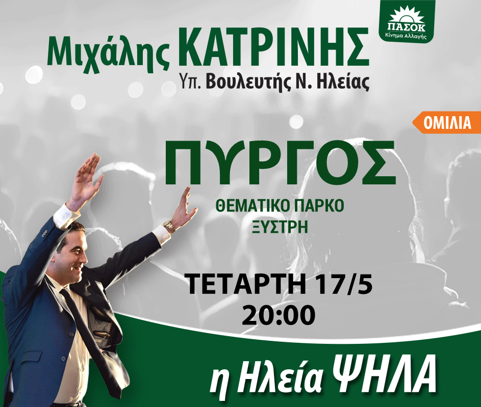 Την Τετάρτη 17 Μαΐου θα κάνει την προεκλογική του ομιλία στην πρωτεύουσα της Ηλείας, τον Πύργο ο υποψήφιος βουλευτής του νομού Μιχάλης Κατρίνης. Η ομιλία θα γίνει στο Θεματικό Πάρκο Ξυστρή στις 20.00 το απόγευμα.