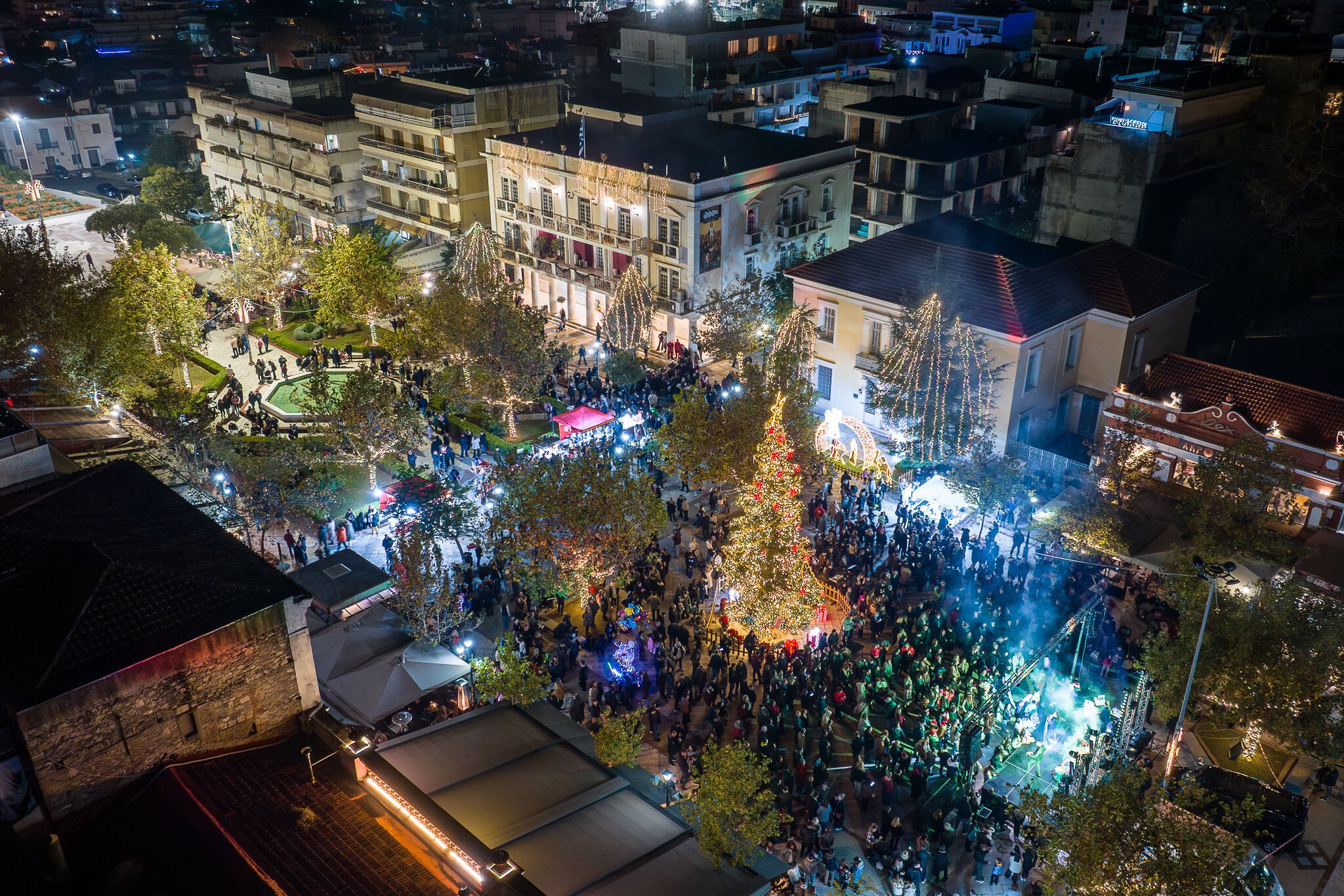 Τη στιγμή που τα φωτάκια του πανύψηλου Χριστουγεννιάτικου δέντρου άναψαν, ένα κύμα ενθουσιασμού πλημμύρισε την πλατεία! Ο ουρανός φωτίστηκε από εντυπωσιακά πυροτεχνήματα, ενώ η ατμόσφαιρα γέμισε με χριστουγεννιάτικες μελωδίες από τη Φιλαρμονική «Απόλλων» του