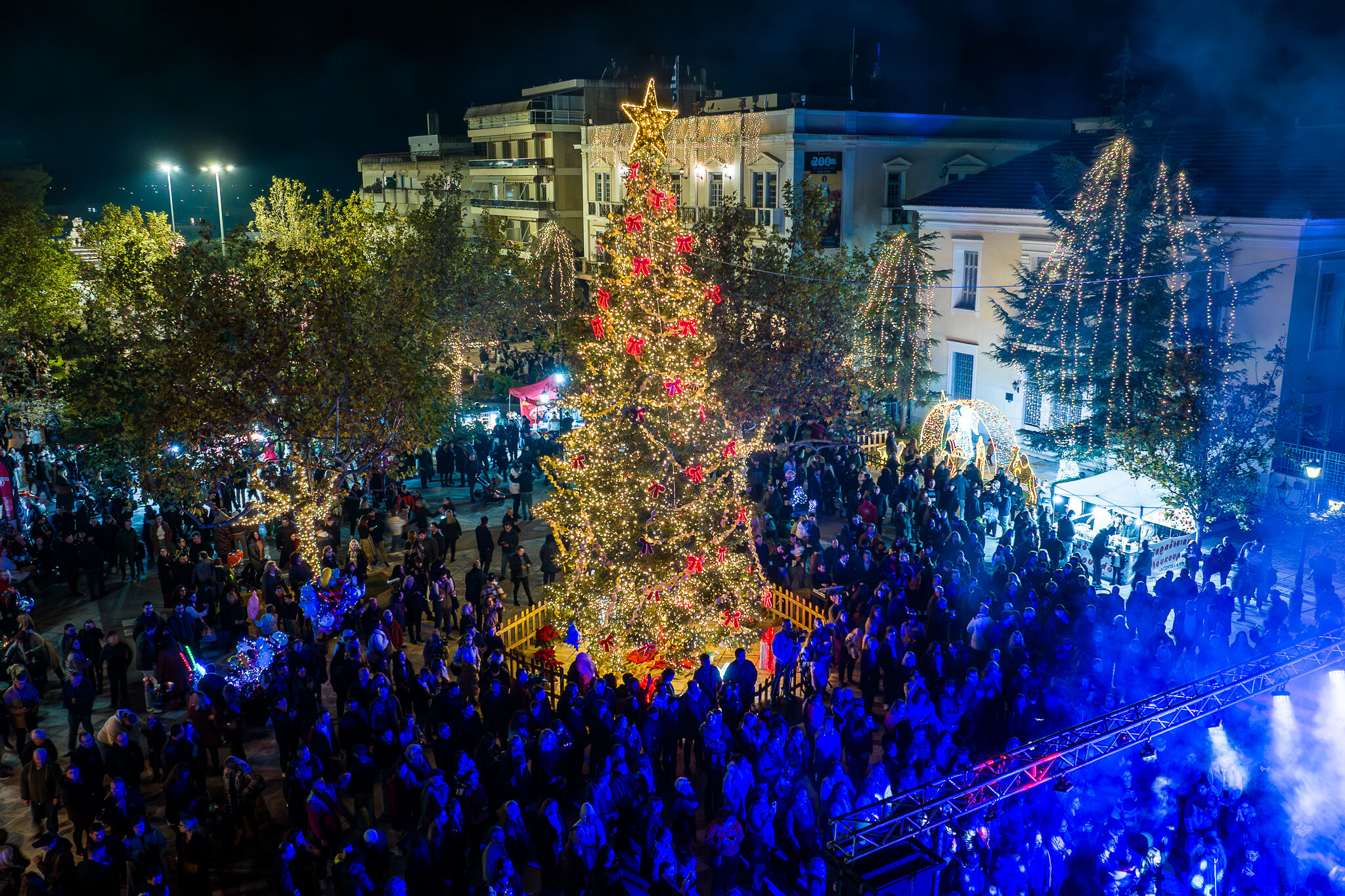 Τη στιγμή που τα φωτάκια του πανύψηλου Χριστουγεννιάτικου δέντρου άναψαν, ένα κύμα ενθουσιασμού πλημμύρισε την πλατεία! Ο ουρανός φωτίστηκε από εντυπωσιακά πυροτεχνήματα, ενώ η ατμόσφαιρα γέμισε με χριστουγεννιάτικες μελωδίες από τη Φιλαρμονική «Απόλλων» του
