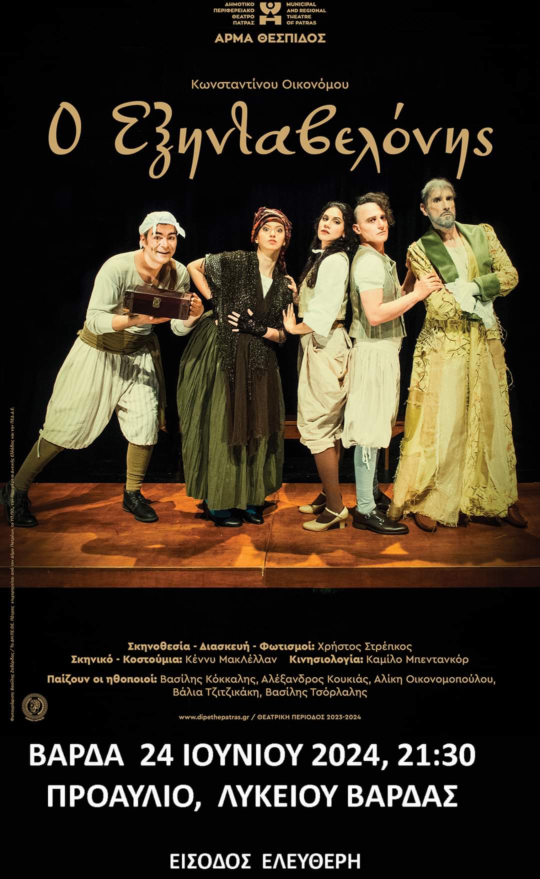 Την Δευτέρα 24/06/2024 και ώρα 21:30 στον αύλειο χώρο του Λυκείου Βάρδας το Άρμα Θέσπιδος του Δημοτικού Περιφερειακού Θεάτρου Πάτρας παρουσιάζει τον Εξηνταβελόνη του Κωνσταντίνου Οικονόμου , ένα από τα σημαντικότερα έργα του νεοελληνικού διαφωτισμού.