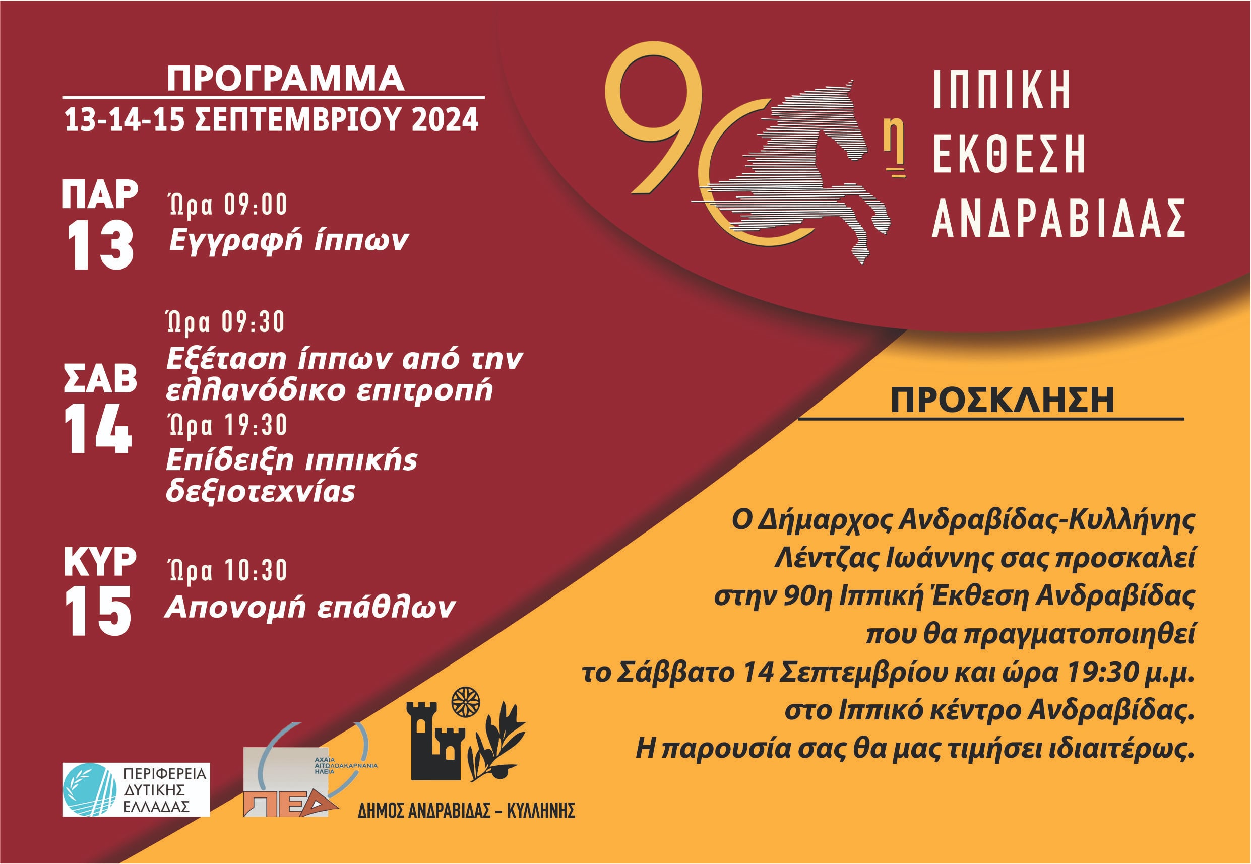 Υπό την αιγίδα του Δήμου Ανδραβίδας-Κυλλήνης, με συνδιοργάνωση της Περιφέρειας Δυτικής Ελλάδας και της ΠΕΔ, και με την συνεργασία από τον Όμιλο Φιλίππων Ανδραβίδας «Σπάρτακος» και τον Ιππικό Σύλλογο Ανδραβίδας «Κένταυροι», η Ιππική Έκθεση συμπληρώνει φέτος τα 90 χρόνια ζωής και σας προσκαλεί να την τιμήσετε με την παρουσία σας!