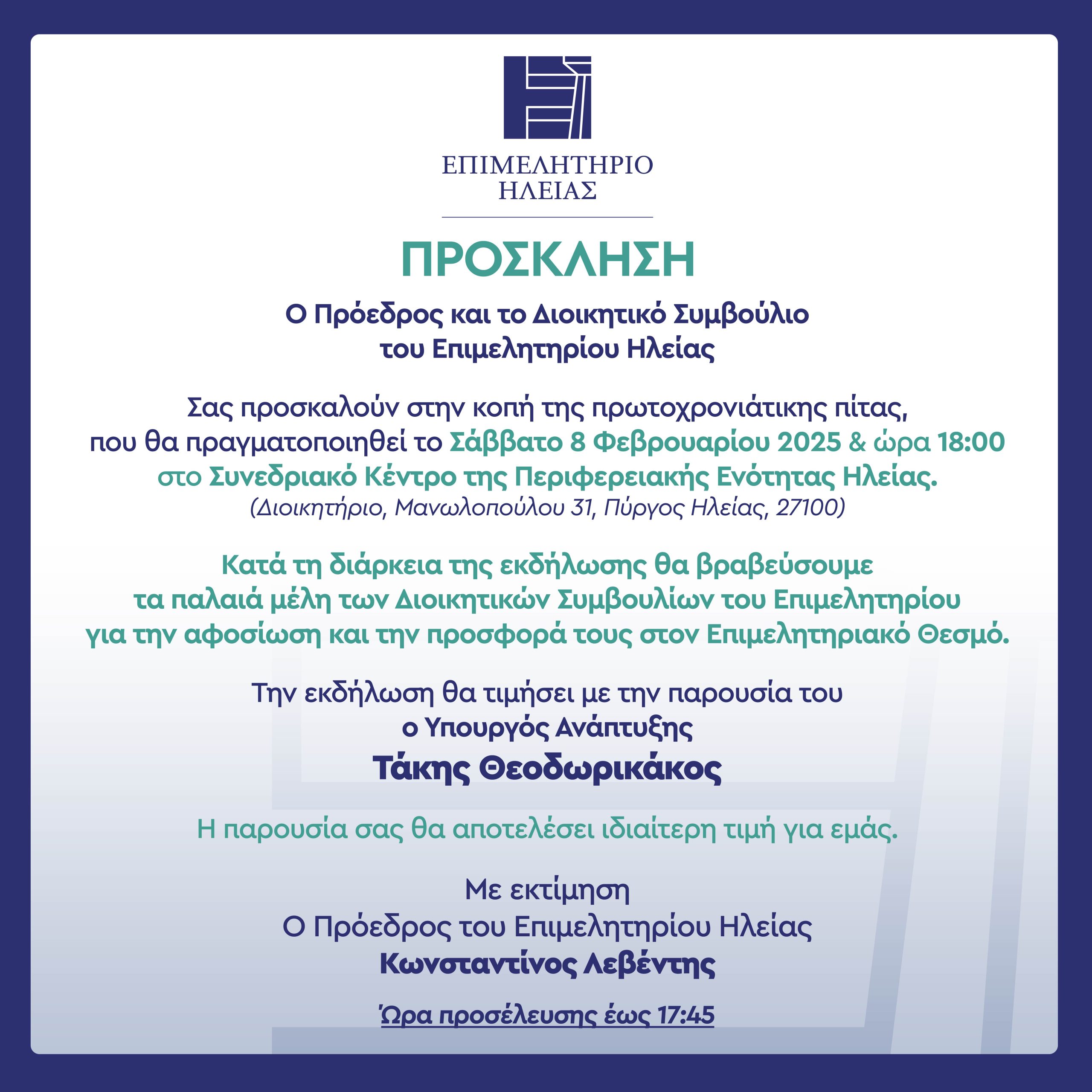 Το Σάββατο κόβει την πίτα του το Επιμελητήριο Ηλείας-Παρών ο Υπουργός Ανάπτυξης Τ. Θεοδωρικάκος