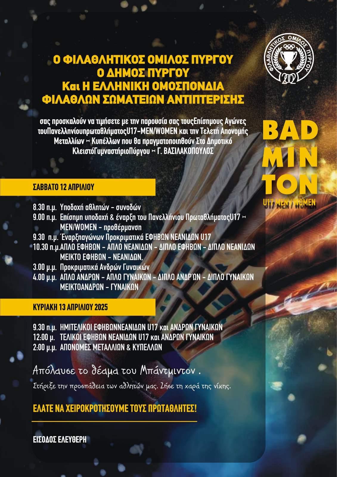 Πυρετώδεις είναι οι προετοιμασίες για το Πανελλήνιο πρωτάθλημα Badminton που θα διεξαχθεί στην πόλη μας το Σαββατοκύριακο 12-13 Απριλίου 2025. Τόσο ο Δήμος όσο και ο Φιλαθλητικός σαν σύλλογος κάνουν ότι είναι απαραίτητο ώστε το πανελλήνιο αυτό τουρνουά να έχει την μέγιστη επιτυχία οργανωτικά και οι επισκέπτες της πόλης μας, αθλητές και συνοδοί να βιώσουν τα καλύτερα.