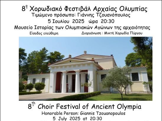H Μικτή Χορωδία Πύργου, o Δήμος Αρχαίας Ολυμπίας, και η περιφέρεια Δυτικής Ελλάδας, τμήμα Πολιτισμού σας προσκαλούν στο 8ο Χορωδιακό Φεστιβάλ Αρχαίας Ολυμπίας που θα πραγματοποιηθεί το Σάββατο 5 Ιουλίου στον προαύλιο χώρο του Μουσείου της Ιστορίας των Ολυμπιακών Αγώνων της Αρχαιότητας “Σύγγρειον”.