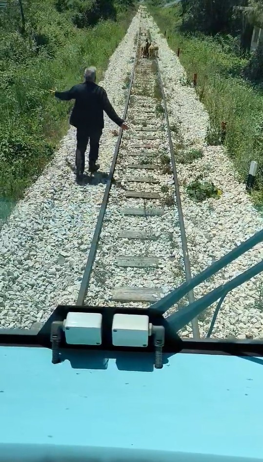 Ευτυχώς ο έμπειρος μηχανοδηγός τα βλέπει από μακριά και κορνάρει και αν δεν φύγουν κατεναίνουν από το τραίνο να τα διώξουν για να συνεχίσει την πορεία του το τραίνο!!!