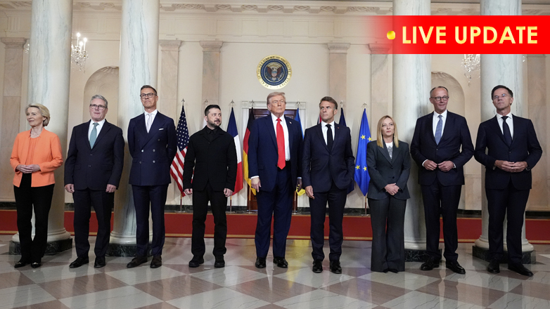 Οι επτά ηγέτες που συναντιόνται με τον Αμερικανό πρόεδρο είναι οι: Oύρσουλα φον ντερ Λάιεν, Κιρ Στάρμερ, Εμανουέλ Μακρόν, Τζόρτζια Μελόνι, Φρίντριχ Μερτς, Αλεξάντερ Στουμπ και ο επικεφαλής του ΝΑΤΟ, Μαρκ Ρούτε.