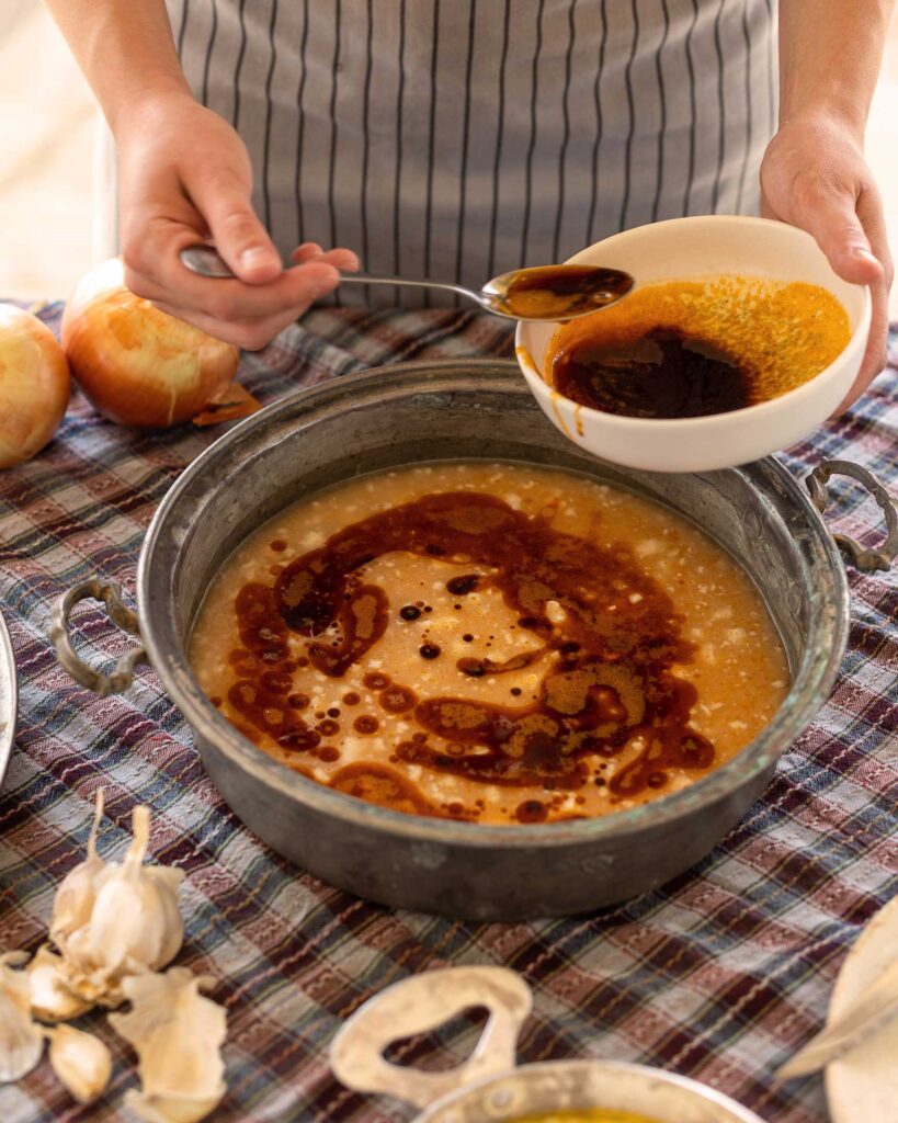 - Ανακατεύουμε ώστε όλη η σούπα να πάρει βαθύ κοκκινωπό χρώμα.