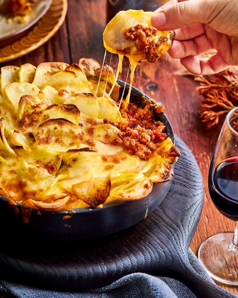 Αδειάζουμε τον κιμά σε ένα βαθύ στρογγυλό πυρίμαχο σκεύος, έτσι ώστε να καλύψει όλο τον πάτο, και τον ισιώνουμε. Ξεκινώντας από την περιφέρεια, τοποθετούμε γύρω γύρω στον κιμά φέτες πατάτας όρθιες, τη μία δίπλα στην άλλη, έτσι ώστε η μία να μισοκαλύπτει την άλλη.