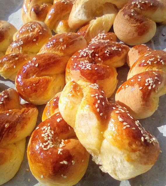 Προθερμαίνετε το φούρνο στους 40οC πάνω κάτω. Μέσα σε ένα μπολ διαλύετε τη μαγιά στο χλιαρό γάλα. Προσθέτετε τα 250γρ. από το αλεύρι και φτιάχνετε έναν πηχτό χυλό. Σκεπάζετε το μπολ με πετσέτα κουζίνας και αφήνετε το μίγμα να φουσκώσει. Ανακατεύετε το υπόλοιπο αλεύρι με το αλάτι, τη μαστίχα και το μαχλέπι.