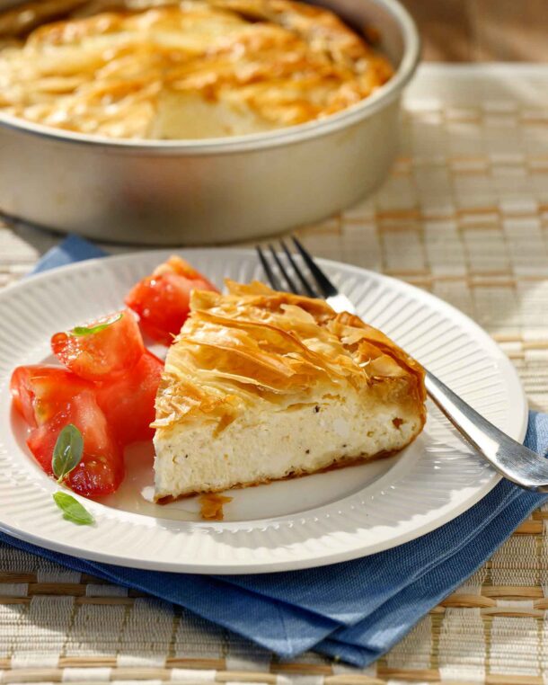 - Ψήνουμε την πίτα στο μεσαίο ράφι του φούρνου για 30 λεπτά ή μέχρι να ροδίσουν τα φύλλα.