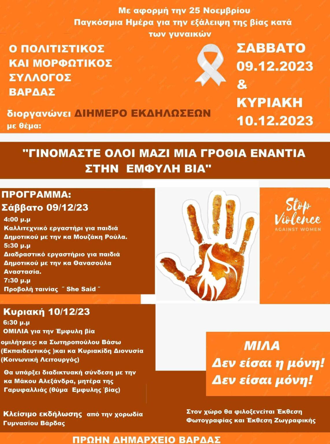 Διήμερο εκδηλώσεων με αφορμή την Παγκόσμια Ημέρα για την εξάλειψη της βίας κατά των γυναικών, διοργανώνει ο Πολιτιστικός και Μορφωτικός Σύλλογος Βάρδας Σαββατοκύριακο, στο πρώην δημαρχείο Βάρδας. To Σάββατο στις 4 το μεσημέρι θα υλοποιηθεί θεατρικό εργαστήρι για παιδιά δημοτικού με την Ρούλα Μουζάκη και θα ακολουθήσει στις 5.30 το απόγευμα διαδραστικό εργαστήριο για παιδιά δημοτικού με την Αναστασία Θανασούλα. Η εκδήλωση του Σαββάτου θα κλείσει με προβολή της ταινίας «She Said» στις 7.30 το απόγευμα.