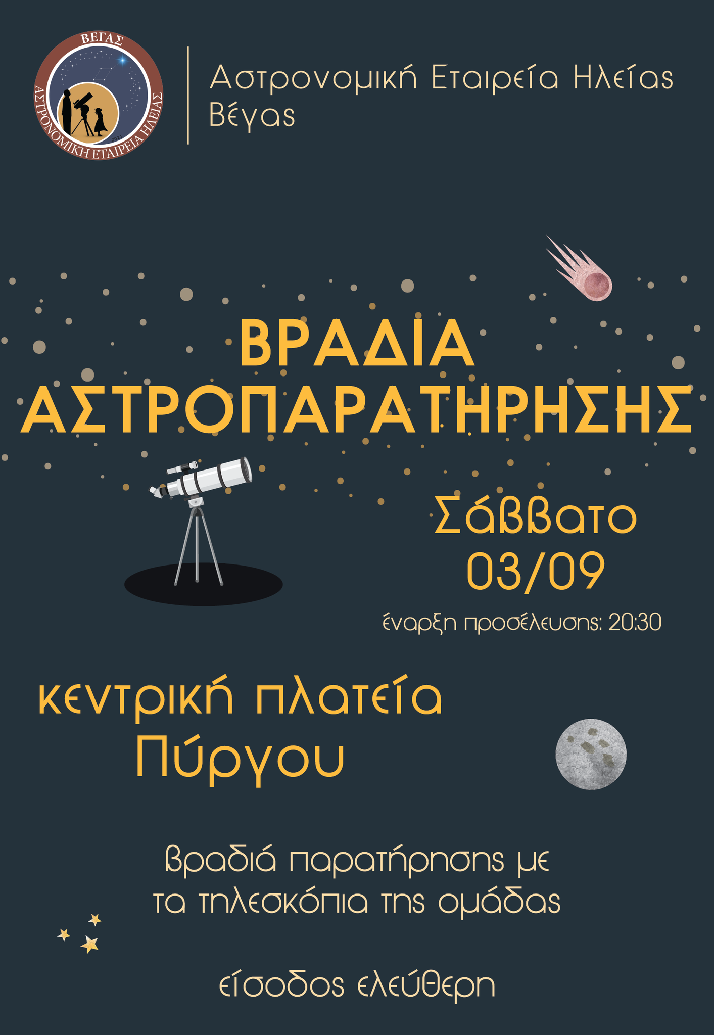 Η Αστρονομική Εταιρία Ηλείας ¨Βέγας¨ διοργανώνει το Σάββατο 03/09 από τις 20:30 και μετά παρατήρηση άστρων και του νυχτερινού ουρανού.