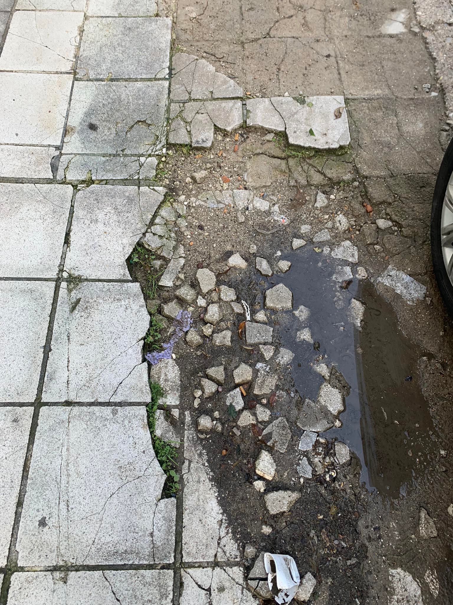 Δίπλα το κατεστραμμένο πεζοδρόμιο μετράει θητείες Δημάρχων και συμπληρώνει την εικόνα.