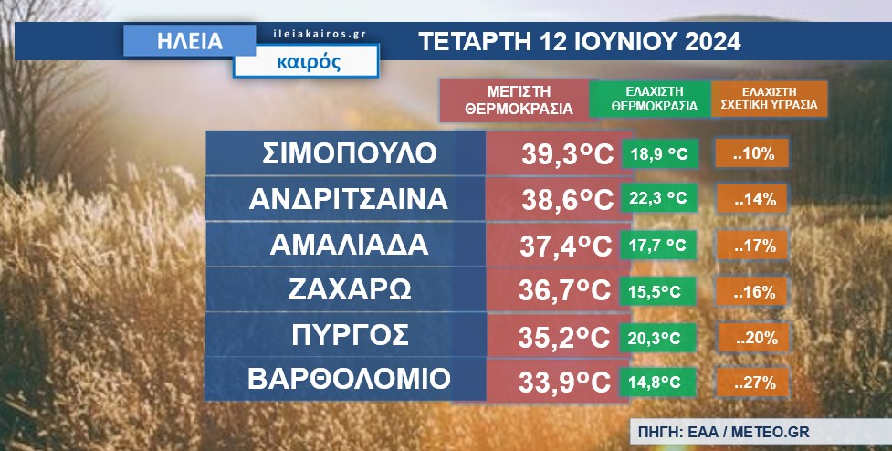 Στην κάρτα βλέπουμε τις περιοχές με τις υψηλότερες θερμοκρασίες όπως καταγράφηκαν από τους μετεωρολογικούς σταθμούς του ΕΑΑ την Τετάρτη 12 Ιουνίου 2024 στην Ηλεία.