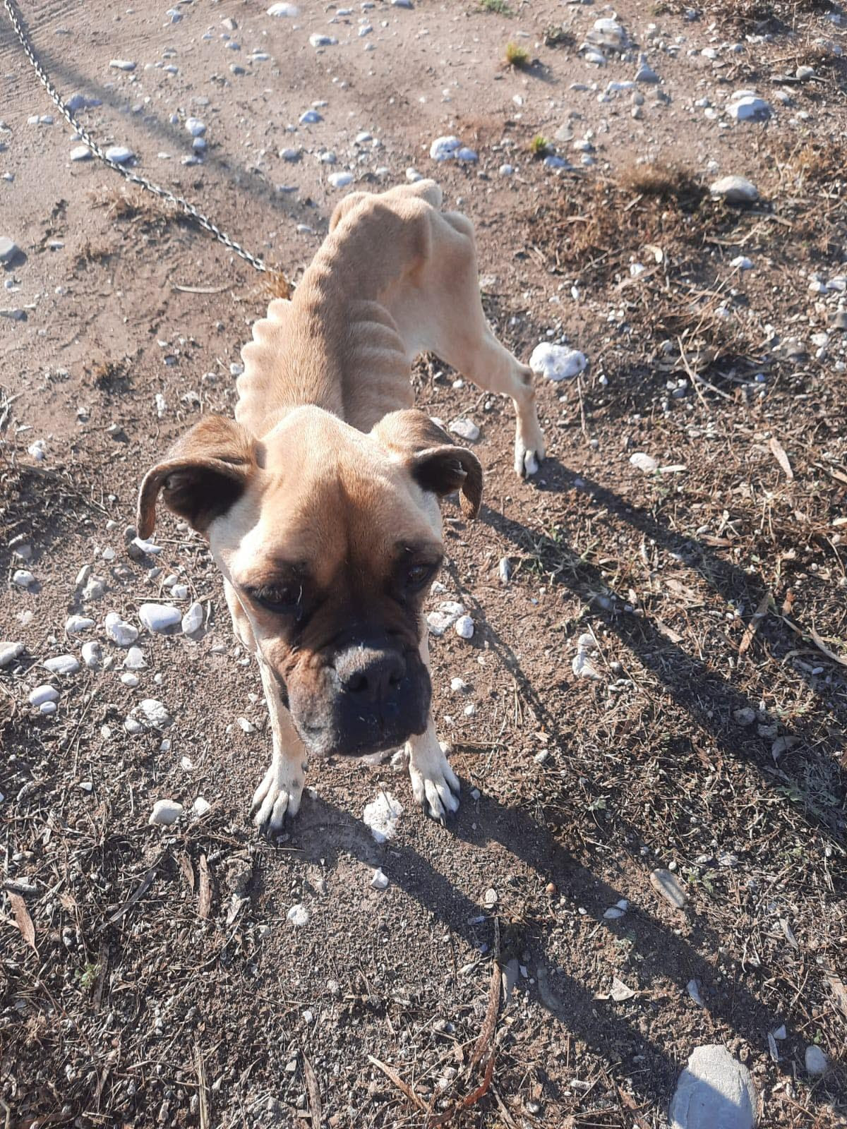 Ακριβώς απέναντι από την παραλία της περιοχής ένα θηλυκό σκυλί ράτσας Boxer δεμένο με χοντρή αλυσίδα. Για την ακρίβεια ένα δείγμα σκυλιού καθώς το ζώο είναι κυριολεκτικά κόκκαλα και δέρμα.
