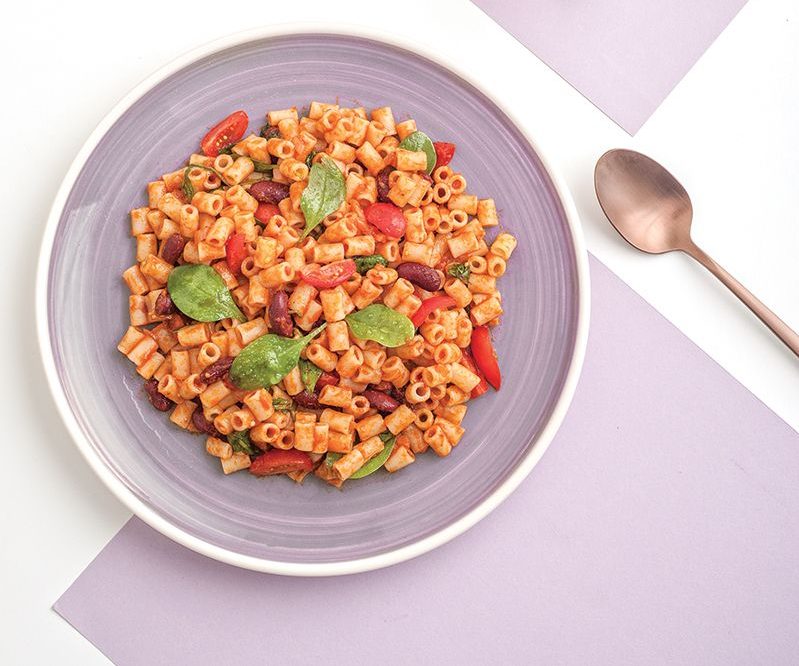 Κοφτό μακαρονάκι με ντοματίνια, σπανάκι και σάλτσα από κόκκινα φασόλια