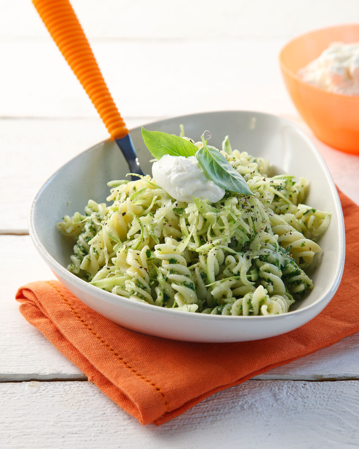 - Τα ρίχνουμε ξανά στην άδεια κατσαρόλα όπου τα βράσαμε, προσθέτουμε το πέστο και τα κολοκυθάκια και ανακατεύουμε.